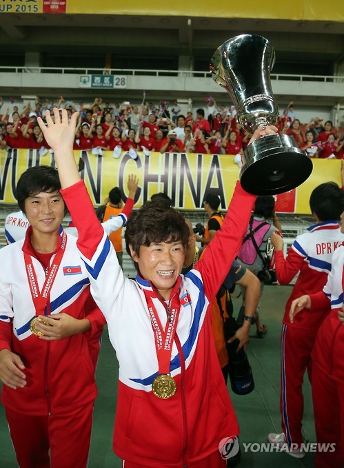 △ 환호하는 북한여자대표팀 (우한<중국>=연합뉴스) 최재구 기자 = 8일 중국 후베이성 우한 스포츠센터에서 열린 동아시안컵 여자축구대회 시상식에서 우승을 차지한 북한 라은심 선수등이 트로피를 들고 환호하고 있다. 2015.8.9 jjaeck9@yna.co.kr