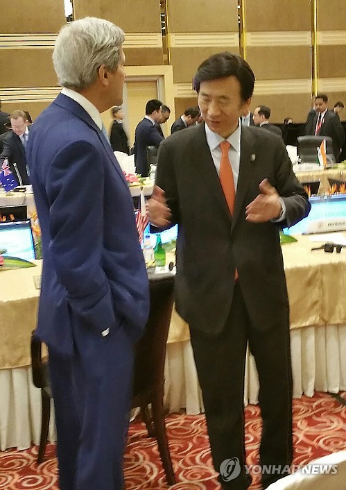| △ 이야기 나누는 한미 외교장관 (쿠알라룸푸르=연합뉴스) 윤병세 외교부 장관이 아세안 관련 연례 외교장관 회의가 열린 말레이시아 쿠알라룸푸르에서 6일 존 케리 미국 국무장관과 만나 이야기를 나누고 있다. 양측 간 정식 회동은 이뤄지지 못했지만 양 장관은 다자회의 계기에 만나 이야기를 나눴다. 2015.8.6 << 외교부 제공 >> photo@yna.co.kr |