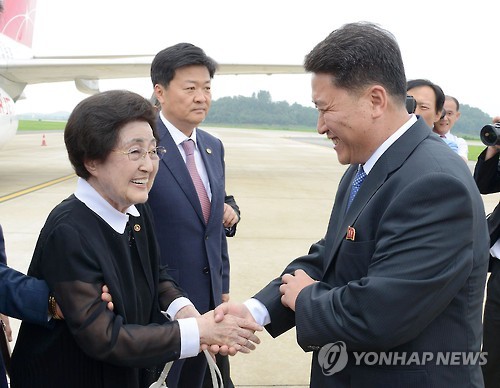 | △ 김대중 전 대통령의 부인 이희호 여사가 5일 오전 북한 평양 순안국제공항에 도착해 맹경일 조선아시아태평양평화위원회 부위원장의 영접을 받고 있다. |
