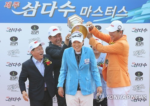 △ 이정은, 제주 삼다수 마스터스 우승 (제주=연합뉴스) 박지호 기자 = 9일 제주 오라컨트리클럽(파72·6천519야드)에서 열린 제주 삼다수 마스터스(총상금 5억원) 마지막 날 3라운드에서 2언더파 70타를 치며 우승을 차지한 이정은(교촌F&B)이 대회 관계자들로부터 축하받고 있다. 2015.8.9 jihopark@yna.co.kr