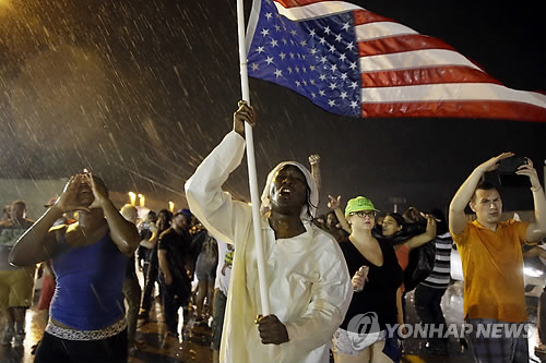 (퍼거슨 AFP=연합뉴스) 작년 퍼거슨 사태의 1주년을 기념하기 위해 미국 미주리 주 세인트루이스 시 외곽의 퍼거슨 시에서 열린 집회에서 총기 20여발이 발사됐다.