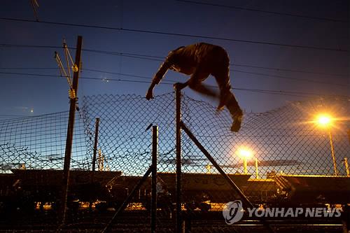 | △ (칼레<프랑스> AP=연합뉴스) 5일(현지시간) 프랑스 북부 항구도시 칼레에서 한 난민이 유로터널 방향 철로에 접근하기 위해 철조망을 넘고 있다. 수천 명의 난민들이 영국행 화물열차나 트럭을 타기 위해 유로터널 근처로 몰려들고 있다. |
