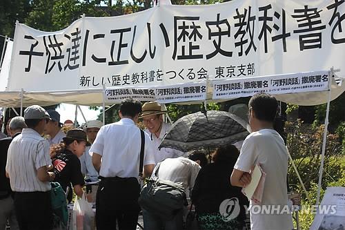 | △ 작년 8월15일 도쿄 지요다(千代田)구의 야스쿠니(靖國) 신사 앞에서 '역사 수정주의' 확산에 앞장서온 우익단체 '새로운 역사교과서를 만드는 모임 도쿄지부' 회원들이 고노(河野)담화 철폐 서명운동을 벌이는 모습(연합뉴스.자료사진) |