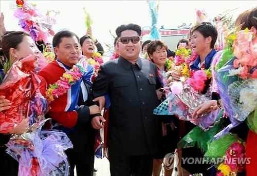 | △ 북한 김정은, 동아시안컵 우승 여자축구선수들 공항까지 마중 (서울=연합뉴스) 김정은 북한 국방위원회 제1위원장이 2015 동아시아축구연맹(EAFF) 축구선수권대회(동아시안컵)에서 우승하고 귀국한 북한 여자 축구선수들을 평양 순안국제공항까지 직접 나가 마중했다고 조선중앙TV가 10일 보도했다. 2015.8.10 nkphoto@yna.co.kr |