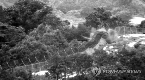 △ 공개된 지뢰폭발 당시 영상 (서울=연합뉴스) 지난 4일 비무장지대(DMZ)에서 우리 군 수색대원 2명에게 중상을 입힌 지뢰폭발사고는 군사분계선(MDL)을 몰래 넘어온 북한군이 파묻은 목함지뢰가 터진 것으로 조사됐다. 합동참모본부가 이날 공개한 영상에 지뢰가 폭발한 뒤 연기와 흙먼지가 솟구치고 있다.<< 합참 제공 >>