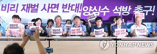 | △ '광복절 특사에 양심수 포함하라' (서울=연합뉴스) 한종찬 기자 = 11일 서울 중구 정동 민주노총에서 열린 '비리 재벌 사면 반대 및 양심수 석방 촉구' 기자회견에서 민주노총을 비롯한 시민단체 회원들이 광복절 특사에 양심수를 포함시킬 것을 정부에 촉구하며 구호를 외치고 있다. saba@yna.co.kr |