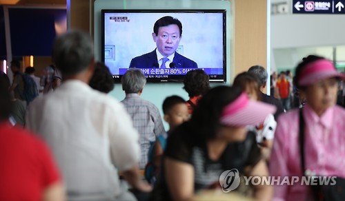 | △ 사과하는 신동빈 회장 (서울=연합뉴스) 안정원 기자 = 11일 서울역 대기실에 설치된 텔레비전에 롯데그룹 신동빈 회장의 경영권 분쟁 관련 대국민 사과가 방송되고 있다. 2015.8.11 jeong@yna.co.kr |
