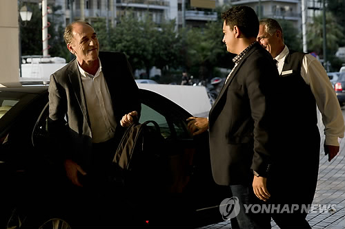 | △ 그리스-채권단, 3차 구제금융 실무협상 타결 (아테네 AP=연합뉴스) 그리스와 국제 채권단이 3년 동안 850억 유로(약 110조3천억원)를 지원하는 3차 구제금융의 실무협상을 타결했다. 사진은 10일(현지시간) 기오르고스 스타타키스 그리스 경제장관(왼쪽)이 채권단과 구제금융 협상을 갖기 위해 아테네 중심가 호텔에 도착하며 환하게 미소 짓는 모습. |
