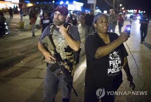 (댈러스=연합뉴스) 장현구 특파원 = 백인 경관의 총격에 사망한 비무장 흑인 청년의 1주기 추모로 시위가 격화한 미국 미주리 주 퍼거슨 시에 난데없이 백인 중무장 단체가 등장해 혼란을 가중시켰다.