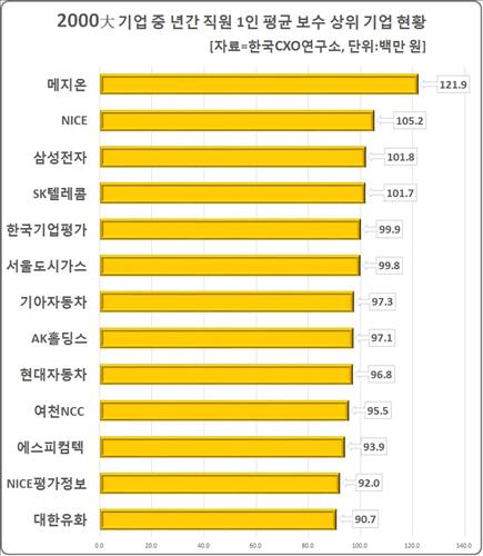 기업분석 전문업체 한국CXO연구소(소장 오일선)는 2014년도 2천대 기업 직원 1인당 평균 보수 분석 결과에서 이같이 나타났다고 12일 밝혔다.