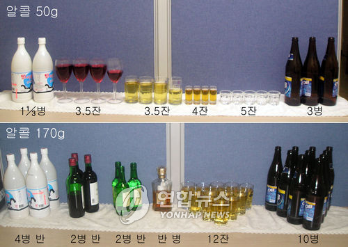 | △ 적정 음주는 포도주, 양주, 소주 등 각 술의 종류에 맞는 술잔으로 남자 2잔, 여자와 노약자는 1잔 정도다. '위험음주(과음)'는 하루 50g 이상, 일주일에 170g의 알콜을 섭취하는 것을 말한다. 알콜 50g은 소주 5잔, 양주 4잔, 맥주 3병, 폭탄주 3.5잔, 와인 3.5잔, 막걸리 1과 3분의 1병에 해당한다(위).알콜 170g은 소주 2병 반, 양주 반 병, 맥주 10병, 폭탄주 12잔, 와인 2병 반, 막걸리 4병 반이다(아래). 이것은 건강한 남자에게만 적용되는 기준이며 여자와 노약자는 그 절반 정도를 기준으로 한다. |
