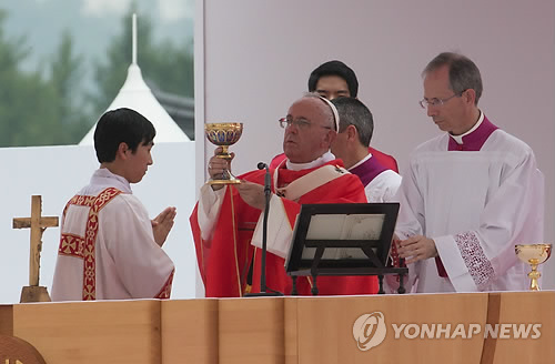 △ 지난해 8월 16일 광화문 광장에서 프란치스코 교황이 시복식 미사를 집전하고 있다. (연합뉴스 자료사진)
