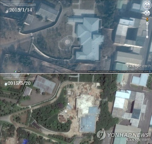 멜빈 연구원은 미국 상업위성이 5월20일 평양 중심부에 있는 김정은 제1위원장의 15호 관저를 촬영한 위성사진을 4개월 전인 1월14일 촬영한 사진과 비교한 결과, 15호 관저의 북쪽 지붕이 철거됐다고 설명했다.