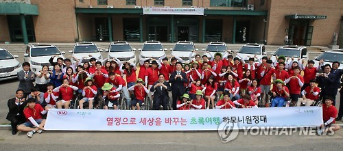 △ 기아차 '초록여행 하모니 원정대 3기' 발대식 (서울=연합뉴스) 12일 경기도 김포 효원문화센터에서 열린 '초록여행 하모니원정대 3기 발대식'에서 김승진 기아차 전무, 김선규 사단법인그린라이트 회장 등 참가 대학생들이 기념촬영을 하고 있다. 초록여행 하모니원정대는 장애인 대학생 2명, 일반인 대학생 3명이 팀을 이뤄 6박 7일간 카니발 이지무브 차량을 타고 국내를 여행하면서 장애인 편의 시설을 점검하는 사업이다. (기아차 제공)