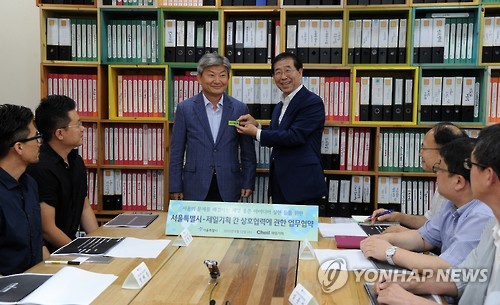 | △ 서울시-제일기획, 서울의 문제해결 공익프로젝트 협력 (서울=연합뉴스) 서울시는 서울에서 일어나는 여러 분야의 사회문제들을 민관협력 방식으로 풀고자 공익 프로젝트를 추진하기로 하고 12일 제일기획과 업무협약을 체결했다. 사진은 임대기 제일기획 사장(왼쪽)에게 '친구' 명찰을 달아주고 악수를 나누는 박원순 서울시장. (서울시 제공) |