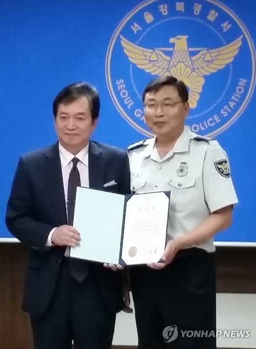 | △ 탤런트 임영규 신고로 보이스피싱 조직원 붙잡아 (서울=연합뉴스) 경찰이 탤런트 임영규씨의 신고로 마약에 취해 있던 전화금융사기(보이스피싱) 조직원을 검거했다. 6일 서울 강북경찰서에서 임영규 씨가 박종천 강북경찰서장에게 감사장을 받고 있다. (서울 강북경찰서 제공) |