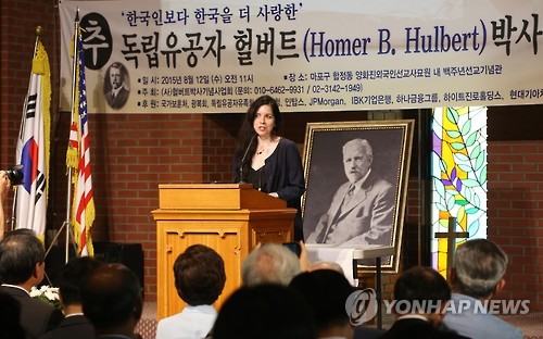 △ '미국인 독립운동가' 헐버트 박사 66주기 추모식 (서울=연합뉴스) 김주성 기자 = 12일 서울 마포구 양화진외국인선교사묘원 내 백주년선교기념관에서 열린 '미국인 독립운동가' 호머 헐버트 박사 66주기 추모식에서 호프 메이 미국 센트럴미시건대 교수가 '헐버트, 진정한 애국자'란 주제로 특별강연을 하고 있다. 1886년 육영공원 교사로 방한한 헐버트 박사는 일제의 만행을 대외적으로 알리고자 지속적으로 노력했고, 특히 1907년 네덜란드 헤이그 만국평화회의 비밀 밀사 파견에 크게 기여해 '제4의 특사'로 불릴 만큼 대한제국의 항일운동에 적극적이었다. 2015.8.12 utzza@yna.co.kr