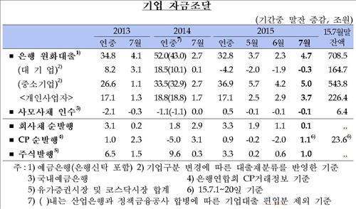 7월 은행의 기업대출은 중소기업을 중심으로 4조7천억원 늘어 6월(2조3천억원)보다 증가 폭이 확대됐다.