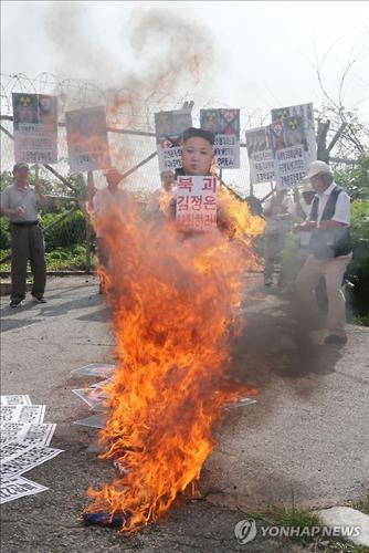 | △ 경기도 파주시 임진각에서 보수단체 회원들이 서부전선 비무장지대(DMZ) 지뢰 폭발 사건에 대해 북한을 규탄하며 김정은 국방위원회 제1위원장의 인형을 태우고 있다.(연합뉴스 자료사진) |
