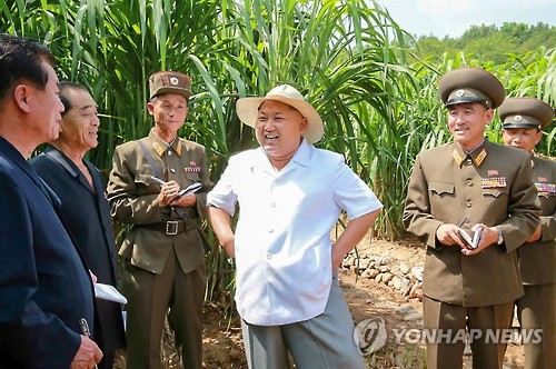 | △ 북한 김정은, 종자농장 시찰…사료작물에 '애국풀' 명명 (서울=연합뉴스) 북한 김정은 국방위원회 제1위원장이 지난 5월에 이어 또다시 인민군 종자연구농장인 제810부대 산하 1116호 농장을 시찰했다고 노동신문이 13일 보도했다. 김정은 제1위원장은 농장이 시험재배하고 있는 사료풀이 다른 사료작물에 비해 수확량이 매우 높다는 사실에 만족감을 나타내면서 '애국풀'이라고 명명했다. 2015.8.13 nkphoto@yna.co.kr |