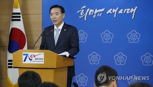 | △ 광복 70주년 특별사면 발표 (서울=연합뉴스) 황광모 기자 = 김현웅 법무부 장관이 13일 오전 서울 세종로 정부서울청사에서 임시국무회의에서 의결된 광복 70주년 특별 사면을 발표하고 있다. |