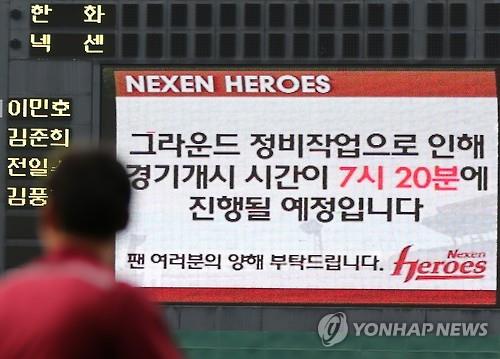 구장 관리요원들이 홈 플레이트와 베이스 근처에 물기를 제거하는 작업을 시작했고, 조종규 경기운영위원은 양팀 사령탑을 찾아 "경기 시작 시간을 30분 정도 늦춰야 한다"고 양해를 구했다.