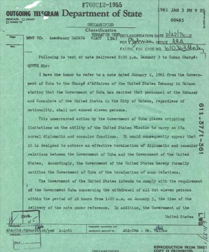 이런 상황에서 1961년 1월 3일 미국 대사관 직원을 줄이라는 쿠바 외교부의 통보는 외교관계 단절의 메시지였다.