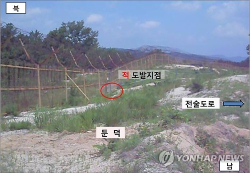 △ 비무장지대 지뢰폭발 현장 (서울=연합뉴스) 지난 4일 비무장지대(DMZ)에서 우리 군 수색대원 2명에게 중상을 입힌 지뢰폭발사고는 군사분계선(MDL)을 몰래 넘어온 북한군이 파묻은 목함지뢰가 터진 것으로 조사됐다. 합동참모본부가 이날 공개한 사고발생 현장. 2015.8.10 << 합참 제공 >> photo@yna.co.kr