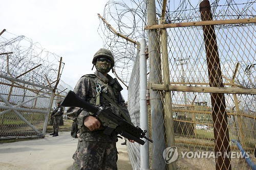 △ In this Aug. 9, 2015, photo provided by the Defense Ministry, a South Korean army soldier stands guard near the scene of a blast inside the demilitarized zone in Paju, South Korea. Vowing to hit back, South Korea said Monday, Aug. 10, 2015, that North Korean soldiers laid the three mines that exploded last week at the border and maimed two South Korean soldiers. (The Defense Ministry via AP)