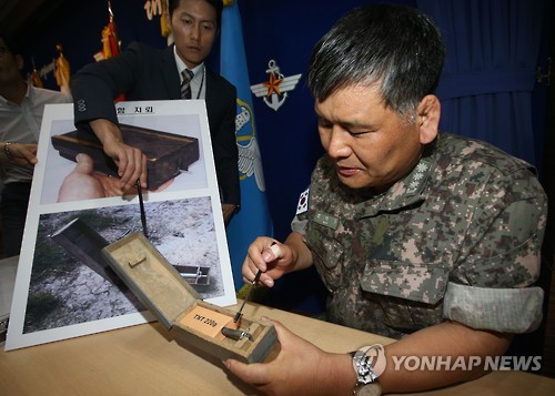 | △ 북한이 DMZ에 매설한 살상용 목함지뢰 (서울=연합뉴스) 임헌정 기자 = 10일 서울 용산 국방부에서 군 관계자가 북한이 비무장지대(DMZ)에 매설한 살상용 목함지뢰에 대해 설명하고 있다. 군 당국은 성명을 통해 강력한 보복응징 의지를 천명하면서 북한에 대해 사과와 책임자 처벌을 촉구했다. 2015.8.10 kane@yna.co.kr |