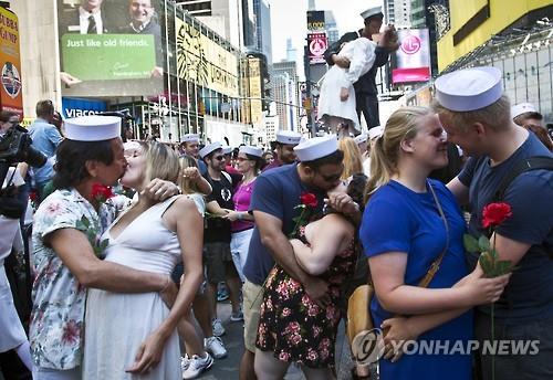 세계서 모인 커플 수백명, 뉴욕 타임스퀘어 '종전 키스' 재연