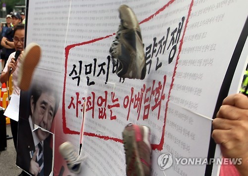 | △ '아베 담화'에 날아든 신발 (서울=연합뉴스) 진성철 기자 = 광복절인 15일 서울 중구 주한 일본대사관 앞에서 우리겨레하나되기운동본부 회원들이 던진 신발이 일본 아베 총리의 전후 70년 담화문에 날아들고 있다. |