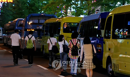 △ 학원가에서 수업을 마친 학생들이 귀가하는 학원버스로 향하고 있다. (연합뉴스 자료사진)