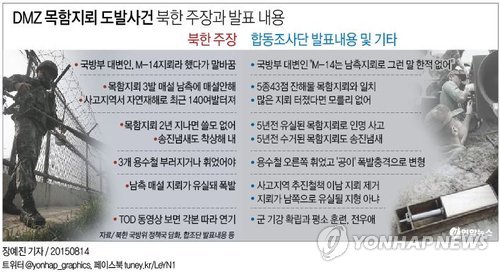| △ <그래픽> DMZ 목함지뢰 도발사건 북한 주장과 발표 내용 (서울=연합뉴스) 장예진 기자 = 북한은 14일 비무장지대(DMZ)에서 폭발한 지뢰가 북한의 목함지뢰라는 지난 10일 남측 발표를 반박하고 나섰다. jin34@yna.co.kr |