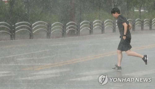 | △ '비를 피해 달리자' (서울=연합뉴스) 한종찬 기자 = 소나기가 내린 16일 오후 서울 목동야구장 인근에서 시민이 길을 건너고 있다. saba@yna.co.kr |