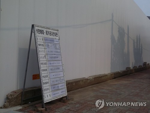 | △ 철거 공사장 입구에 설치된 석면 안내판 (서울=연합뉴스) 서울의 한 아파트 단지 철거공사 현장에 설치된 석면해체·제거공사 안내판. |