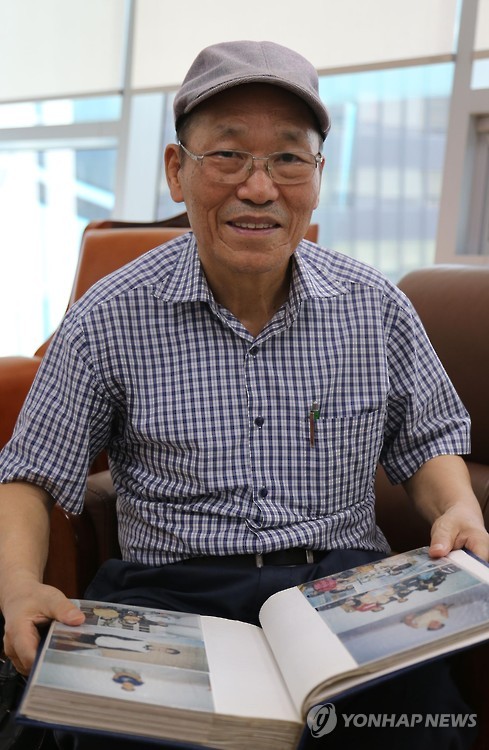 | △ 동남아 거쳐 남한 정착한 탈북자들의 '숨은 대부' 이중렬씨 (서울=연합뉴스) 하사헌 기자 = 1990년대 중반 동남아 제3국으로 건너가 한식당을 운영하며 1천100명이 넘는 탈북자의 남한행을 도왔던 이중렬 씨가 17일 연합뉴스와 인터뷰를 하던 중 그동안의 기록이 담긴 사진첩을 보며 웃고 있다. 2015.8.17 toadboy@yna.co.kr |