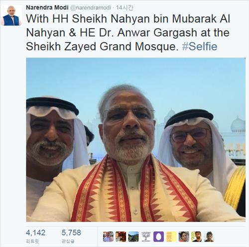 | △ 16일 아랍에미리트(UAE)를 방문한 나렌드라 모디 인도 총리가 자신의 트위터에 올린 셀카<<나렌드라 모디 총리 트위터 캡처>> |