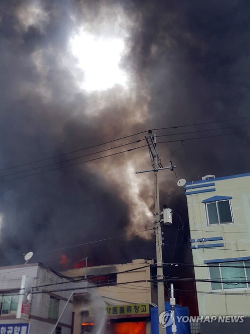 (부산=연합뉴스) 차근호 기자 = 17일 오전 11시께 부산 사상구 삼락동의 한 화학약품 공장 물류창고 1층에서 불이 났다.