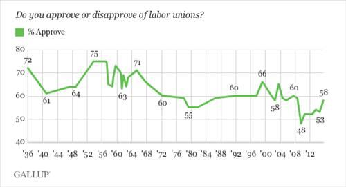 1936년부터 꾸준히 진행된 갤럽의 노조 호감도에 대한 설문조사 결과를 보면 1960년대까지는 60%∼70%의 호감도를 유지했지만, 이후에는 50%대 중반에서 60%대 중반 사이를 오가는 모습을 보였다.