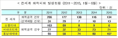 18일 해양수산부에 따르면 상반기 해적공격 사건은 2011년 266건에서 2014년 116건으로 줄었다가 올해 134건으로 다시 증가했다.