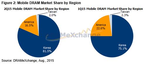 18일 반도체 전자상거래사이트 D램익스체인지(www.dramexchange.com)의 트렌드포스(TrendForce) 보고서에 따르면 2015년 2분기 모바일 D램 시장 매출 점유율은 삼성전자[005930] 57.6%, SK하이닉스[000660] 23.9%, 마이크론(미국) 16.5%, 난야(대만) 1.2%, 윈본드(대만) 0.7%로 집계됐다.