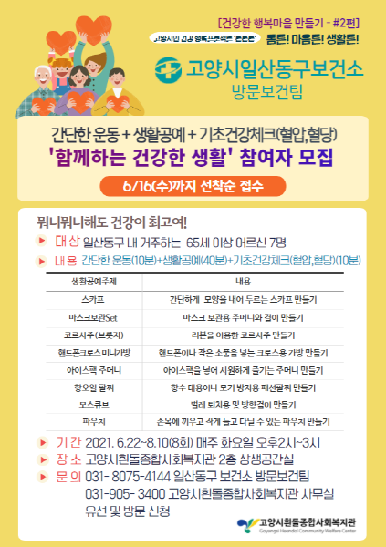 [부자동네타임즈 김인수기자] 고양시 일산동구보건소는 코로나19 장기화로 지친 어르신들의 심신 안정 도모를 위해 오는 6월 22일부터 ‘함께하는 건강한 생활’ 프로그램을 운영한다.