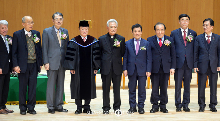 윤장현 광주광역시장이 1일 오후 북구 용봉동 전남대학교 민주마루에서 열린 정병석 제20대 전남대 총장 위임식에 참석해 내빈들과 기념촬영을 했다.