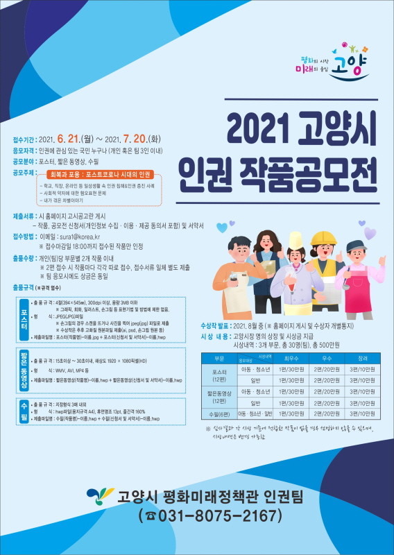 [부자동네타임즈 김인수기자] 고양시가 오는 6월 21일부터 ‘2021 고양시 인권 작품공모전’을 개최한다.