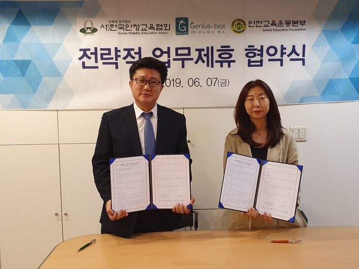 사진 : 6월 7일 강남 지니어스박스 사옥에서 이종덕 교육부공익법인 사)한국안정교육협회장│안전교육운동본부장(왼쪽)과 손미경 지니어스박스 대표(오른쪽)가 MOU 후 기념촬영을 하고 있다.