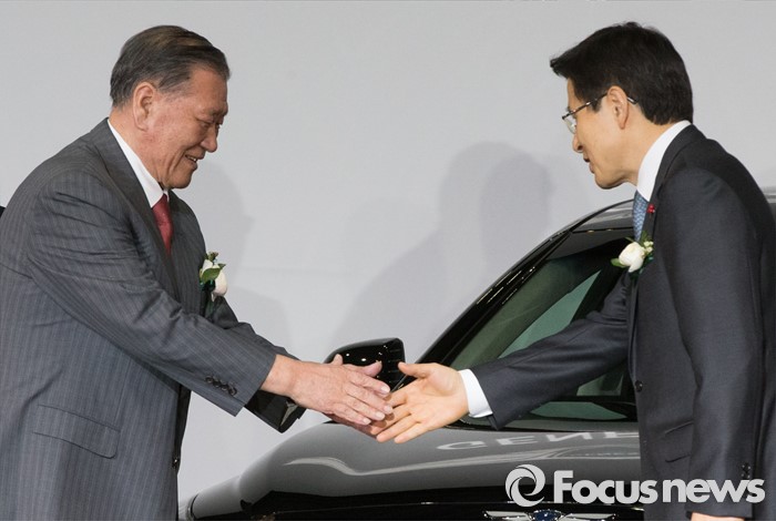 | △ 9일 오후 서울 용산구 그랜드하얏트 호텔에서 열린 현대자동차 '제네시스 EQ900' 신차 발표회에서 황교안(오른쪽) 국무총리와 정몽구 현대자동차그룹 회장이 악수 하고 있다. |