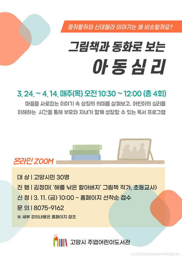프로그램 신청은 3월 11일 오전 10시부터 고양시도서관센터 홈페이지에서 할 수 있다. 보다 자세한 사항은 고양시 도서관센터 홈페이지 문화행사를 참고하거나 주엽어린이도서관으로 전화 문의하면 된다.