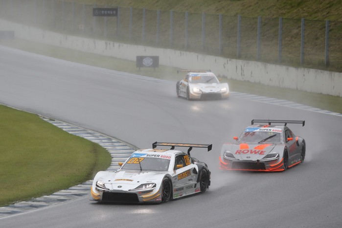 [사진설명] 아트라스BX 모터스포츠의 최명길(왼쪽)이 에버랜드 스피드웨이에서 열린 2021 CJ대한통운 슈퍼레이스 챔피언십 개막전에서 빗길을 헤치며 달리고 있다.