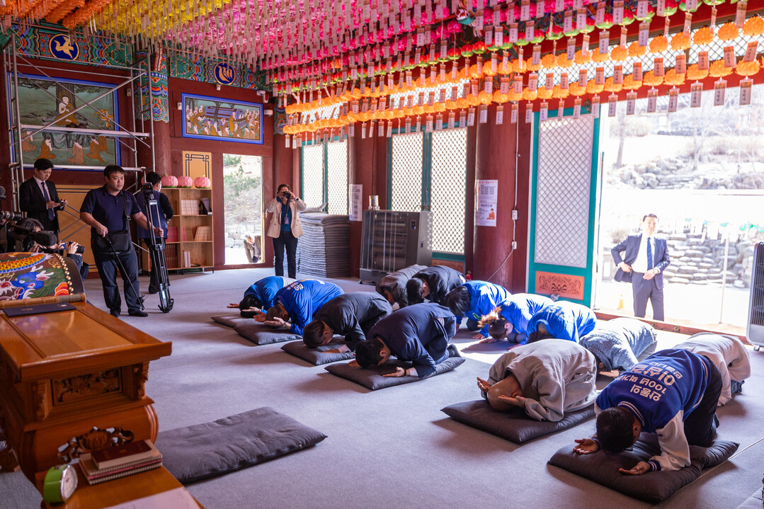 [부자동네타임즈 = 조영재 기자] 더불어민주당 정청래 대표가 지난해 산불로 큰 피해를 본 경북 의성 천년고찰 고운사를 27일 방문해 불전에서 절하고 있다.